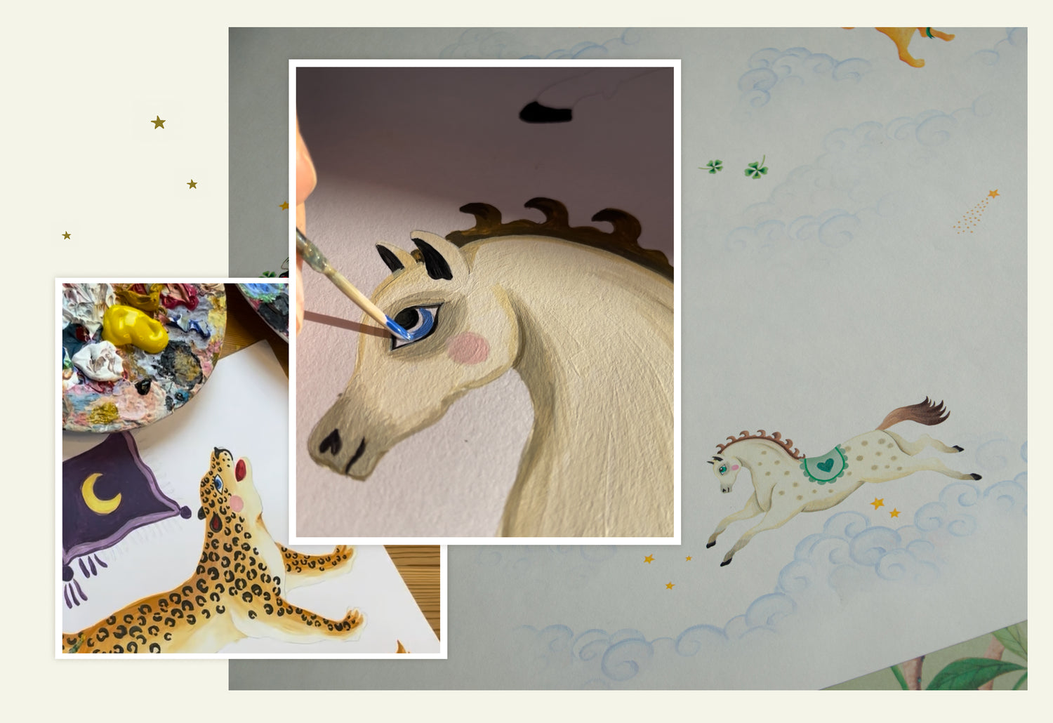 Creëer een speelse en dromerige sfeer met dit behang vol wolken, luchtballonnen en nieuwsgierige dieren. Het ontwerp neemt je mee op reis door een luchtige fantasiewereld waar avontuur en verbeelding samenkomen. Perfect voor de kinderkamer.