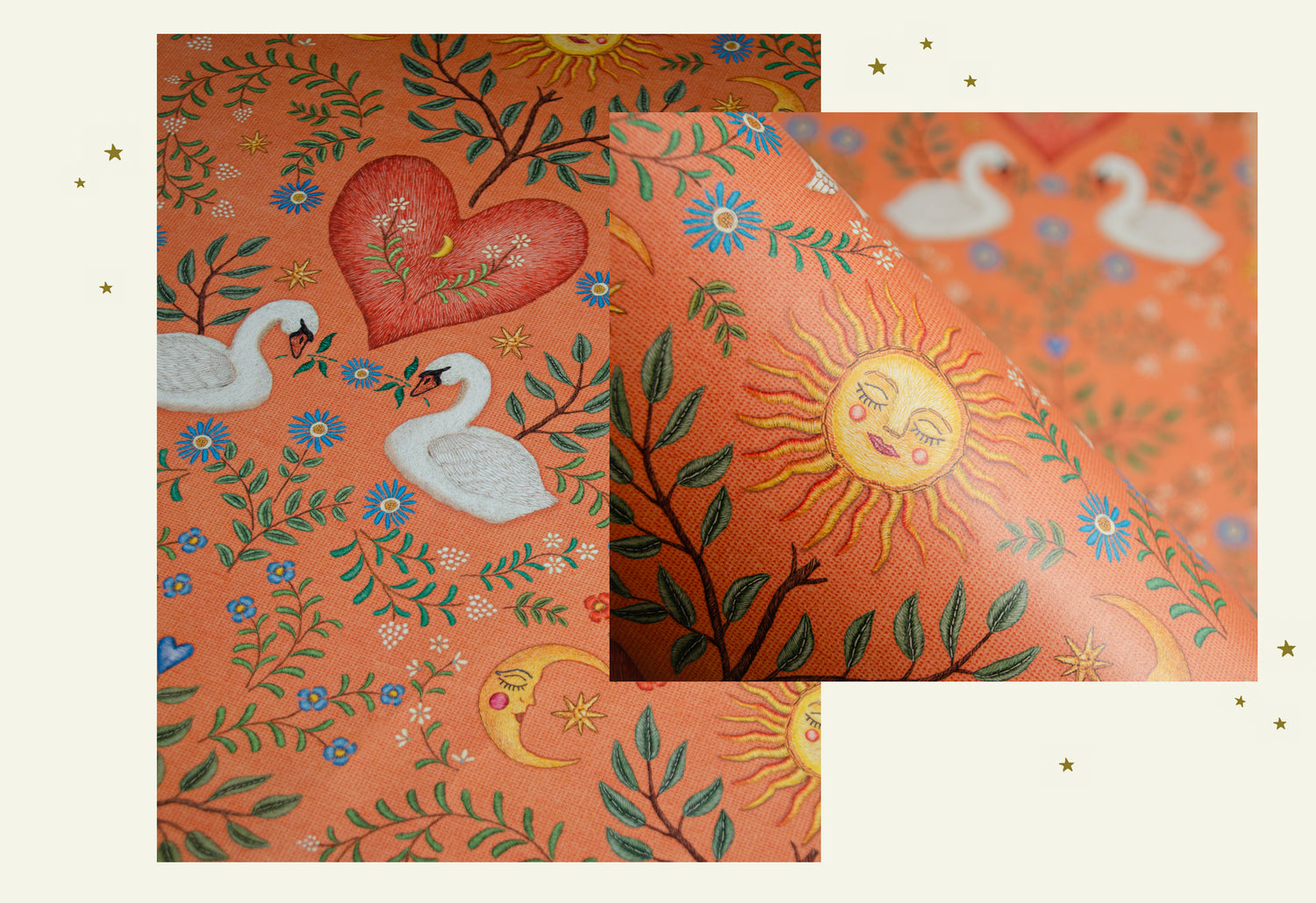 Dit behang brengt een lieve, dromerige sfeer in de kinderkamer met geborduurde illustraties van zwanen, harten en bloemen. De zachte details en speelse uitstraling zorgen voor een warme en veilige omgeving waarin kinderen zich kunnen laten meevoeren in hun eigen fantasiewereld. Een betoverend ontwerp dat rust én vrolijkheid uitstraalt.