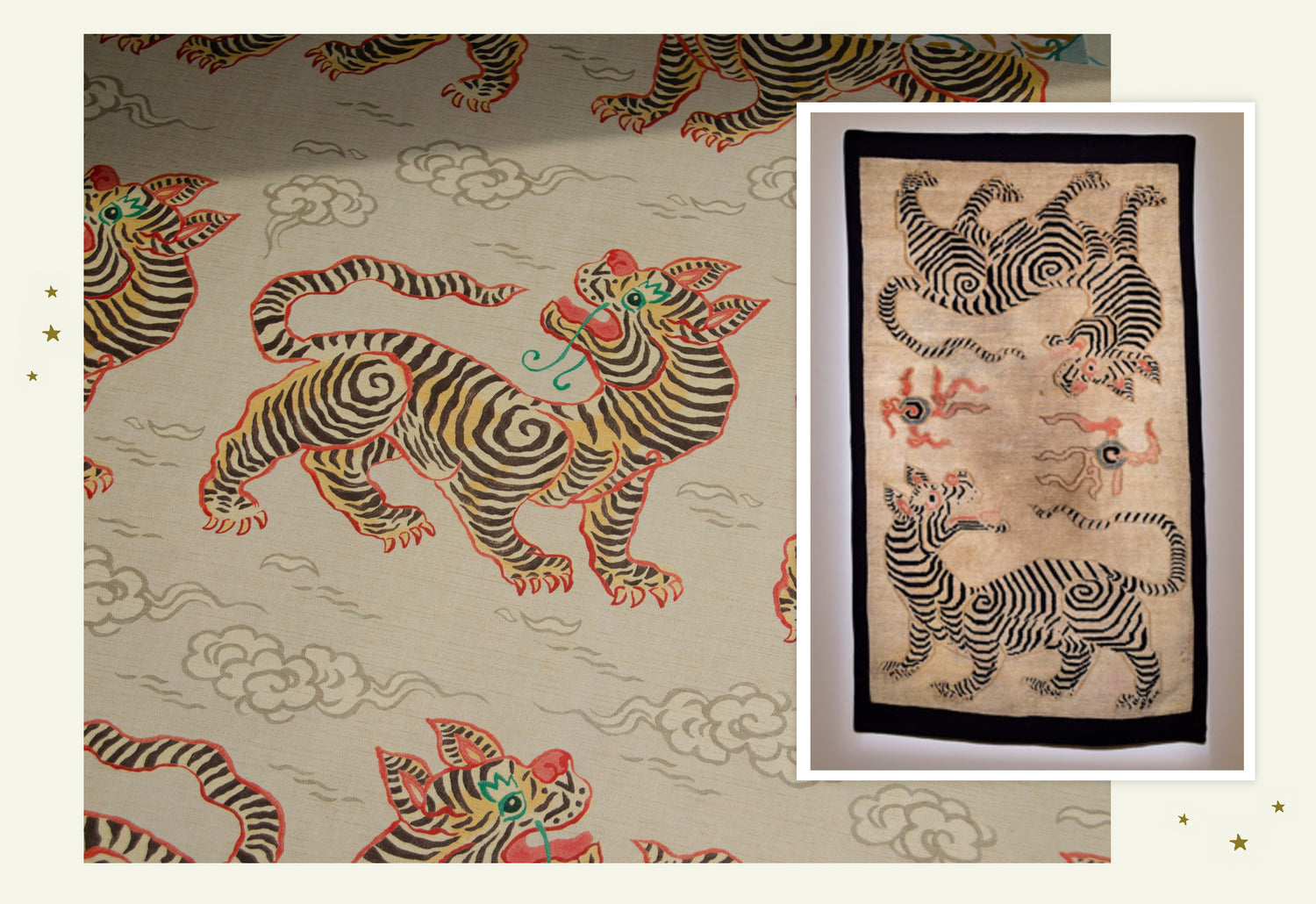 Geef je interieur karakter met dit unieke behang vol vintage Tibetaanse tijgers in vrolijke kleuren. Het dessin is geïnspireerd op traditionele motieven en brengt een speelse mix van kracht, symboliek en levendigheid naar de muur.