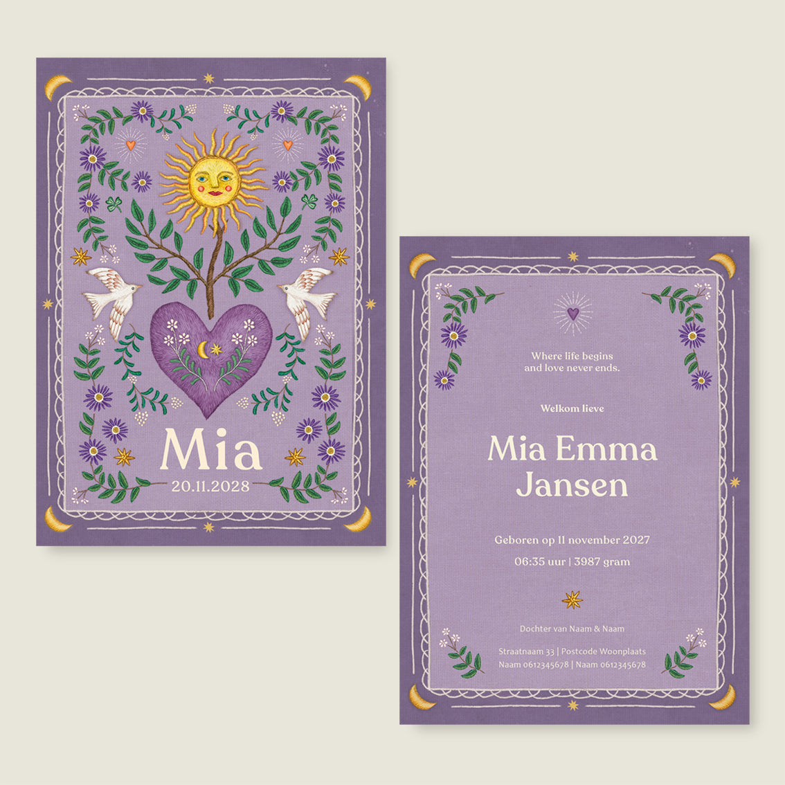 Geboortekaart Sample Heart Bird Paars geeft je de mogelijkheid om een geboortekaartje in het echt te beoordelen voordat je een definitieve bestelling plaatst. Een sample helpt je niet alleen om de kleuren goed te zien, maar ook om de kwaliteit van het papier, de afwerking en de algemene uitstraling van het ontwerp te ervaren. Dit zorgt ervoor dat je met vertrouwen een keuze kunt maken die echt past bij jullie stijl en wensen.