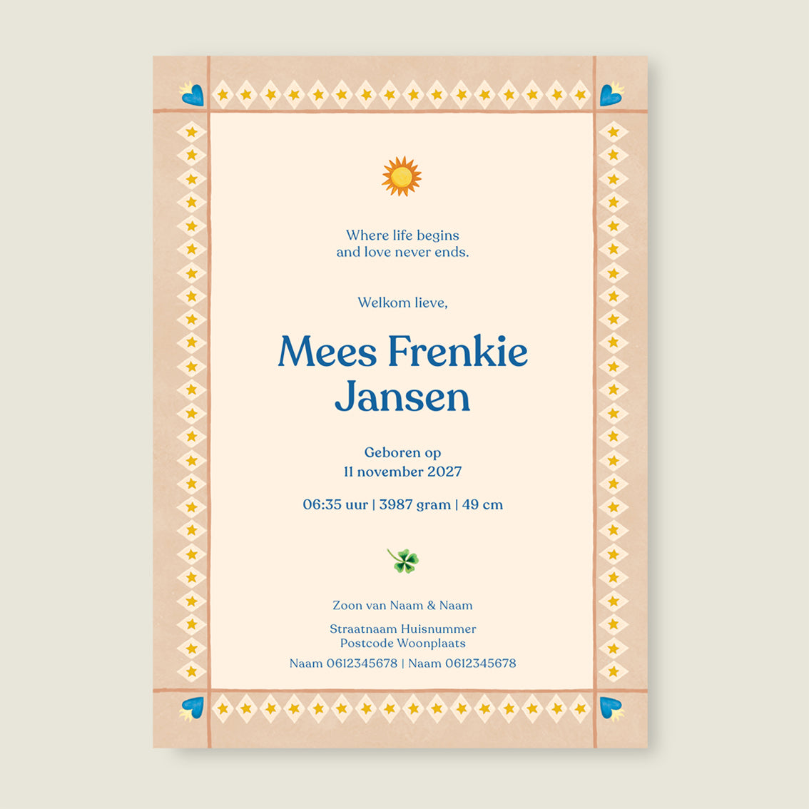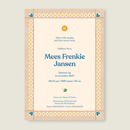 Wil je toch graag zien hoe het ontwerp eruitziet met jullie eigen naam, gegevens of geboorte-informatie? Dan maken we met plezier een digitaal voorbeeld op maat. Zo krijg je een persoonlijk en nauwkeurig beeld van het kaartje, zonder extra drukwerk te hoeven produceren.